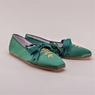 These slip-on shoes are accurate for c. 1800 - 1830. They feature a beautiful satin upper embroidered with a historical design on the vamp, complete with spangles. The edges are bound in petersham, with matching optional ankle ribbons and vamp bow which is easily removed. Period-correct turnshoe construction, soft square toe, and real leather soles make the Penelopes unmatched for evening and formal events where the prettiest of shoes are required. Wear them for Jane Austen, Napoleonic, War of 1812, and all Regency events.