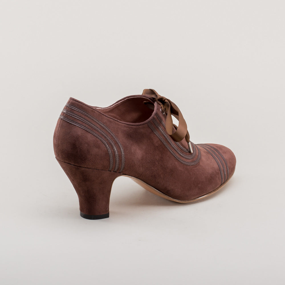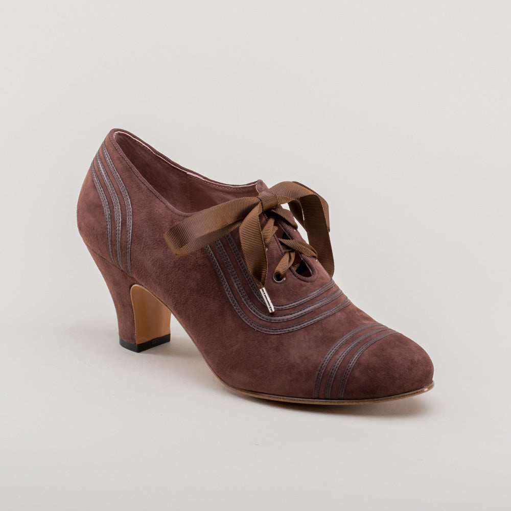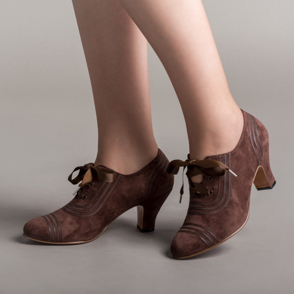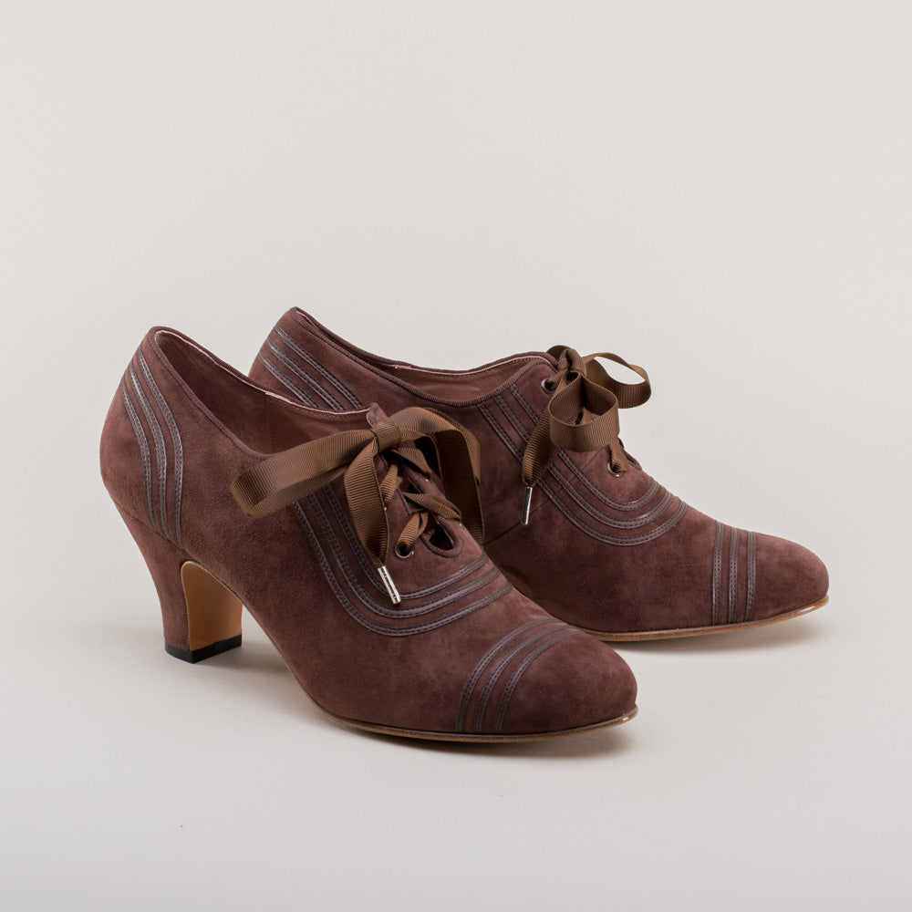 Claremont is made in soft and durable suede, trimmed with matching smooth leather, and tied with grosgrain ribbon bows. These oxfords feature a round '30s toe and our revised, well-balanced 2.5 inch / 6.3 cm Spanish heel. Wear Claremonts with any Art Deco period attire from c. 1925 all the way through the 1940s.