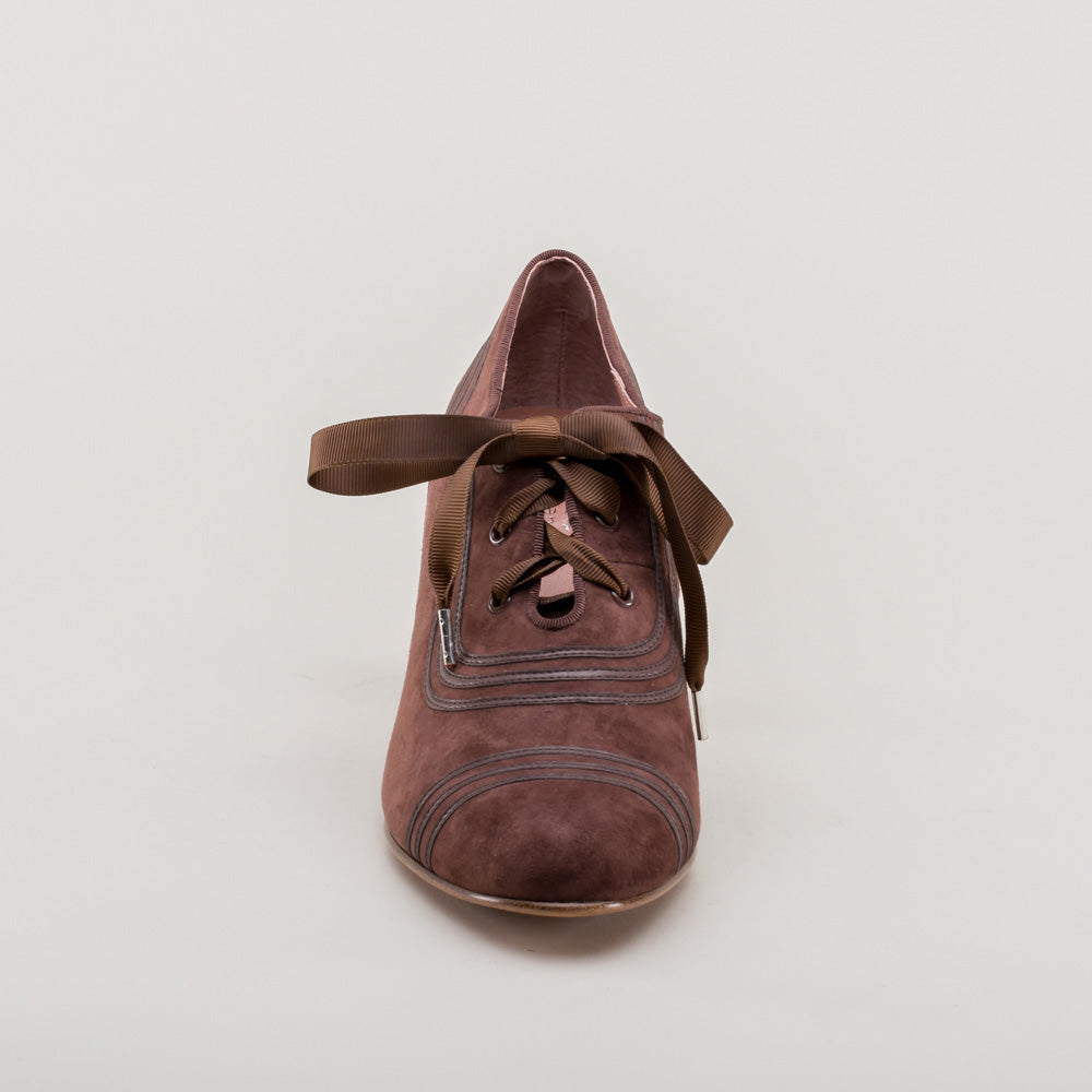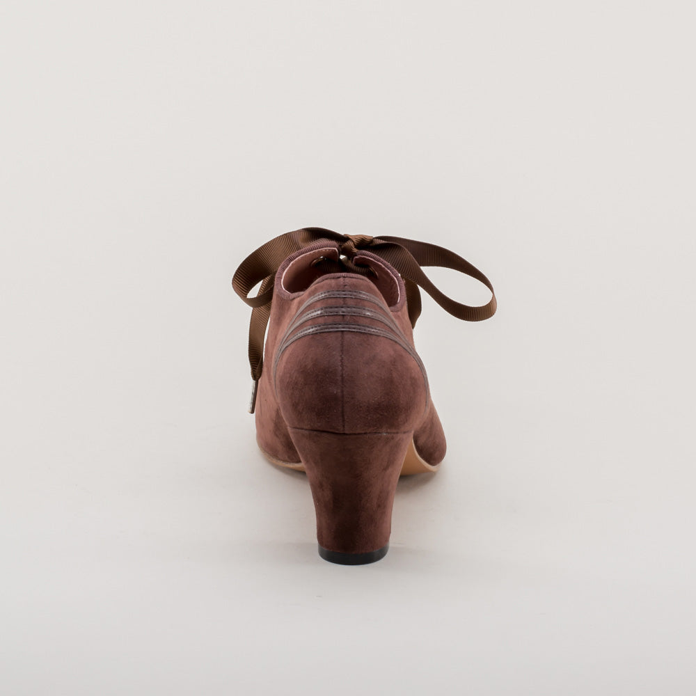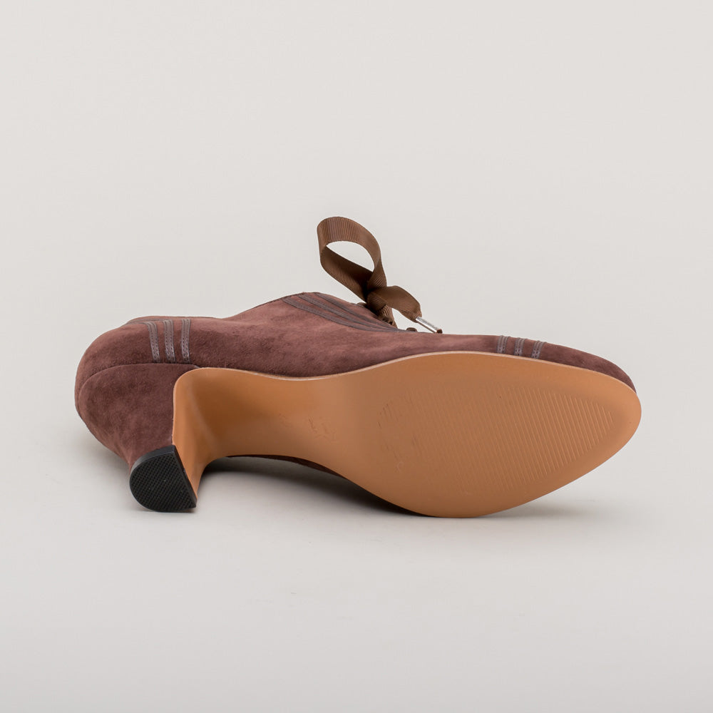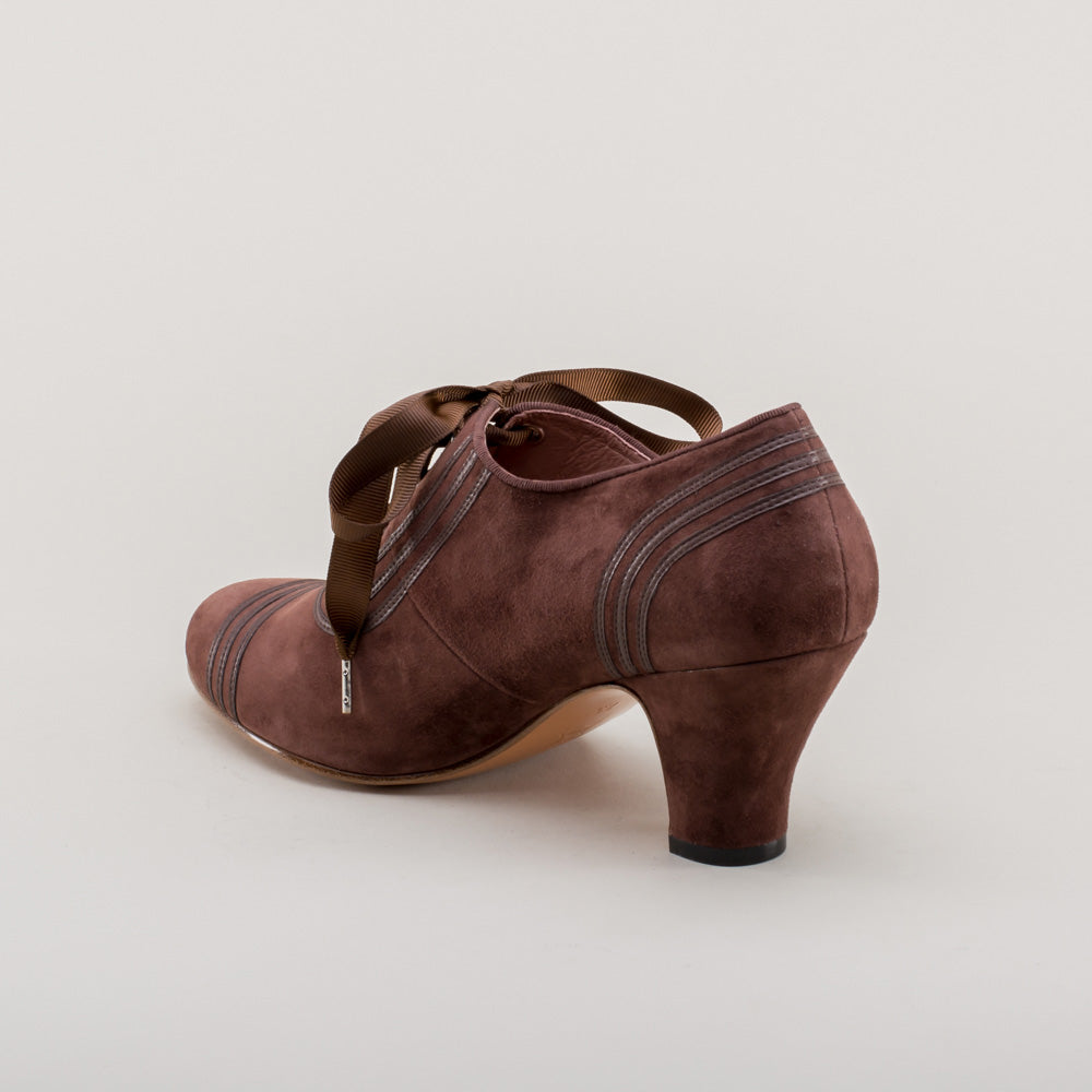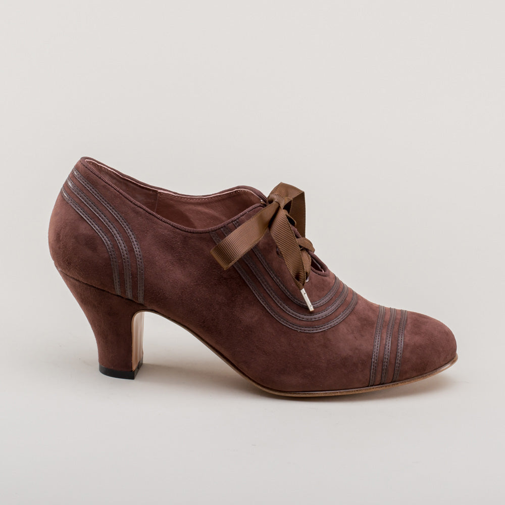 Claremont is made in soft and durable suede, trimmed with matching smooth leather, and tied with grosgrain ribbon bows. These oxfords feature a round '30s toe and our revised, well-balanced 2.5 inch / 6.3 cm Spanish heel. Wear Claremonts with any Art Deco period attire from c. 1925 all the way through the 1940s.