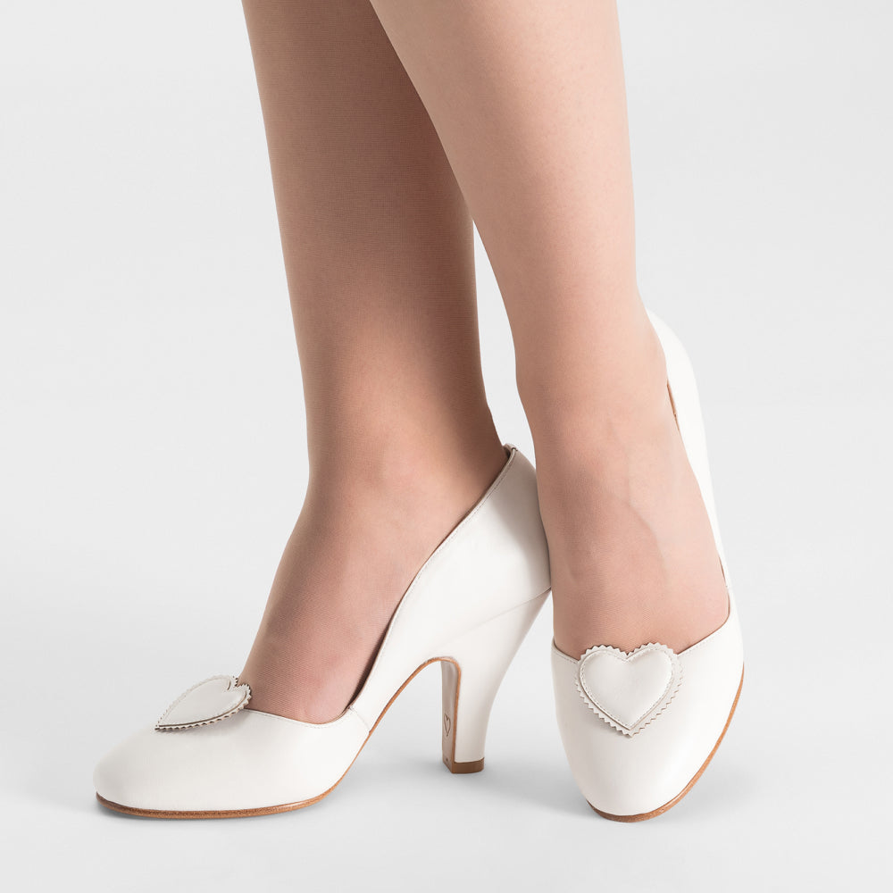 Meet Ginger, a seductive vintage pump that will set your heart aflutter! Marilyn's sophisticated cousin, Ginger is a shapely shoe that features deep, swooping curves that flatter the foot. The breast of Ginger's custom, 3.5" 8.9 cm Spanish heel is decorated with a darling debossed heart. Adorable heart-shaped shoe clips are easy to apply and remove, for added versatility. Pair Ginger with your favorite 1940s and 1950s ensembles, or with your contemporary wardrobe. This definitively fashionable shoe goes with anything and everything, from dresses to trousers, and fluffy petticoats to wiggle skirts.