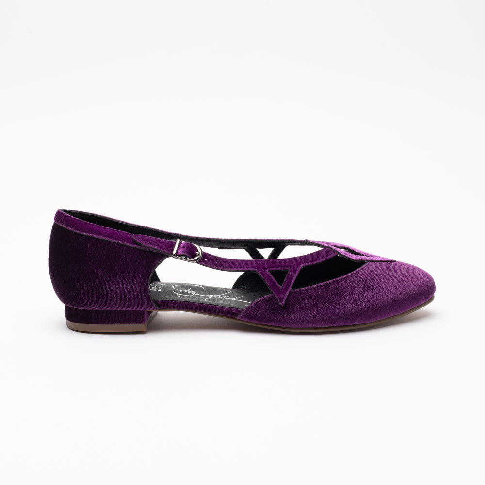 Step into a vintage-inspired fantasy with the Mildred Flats, from our collaboration collection with artist Christine McConnell! Inspired by 1950s 'flatties', these flats are unlike any you've seen before. Uppers in rich, luxe velvet, open sides, and strappy details festooned with geometric motifs make Mildred unique. Mildred features our dependable 0.5"/ 1.27 cm common sense heel, which is low and sturdy for all-day comfort. These shoes are festive, leather-free, and come in five gorgeous colorways.
